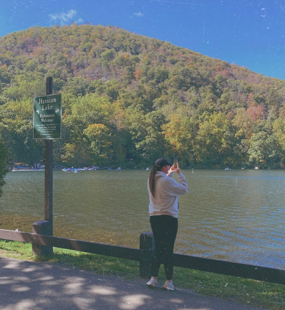 From here it was onto Bear Mountain. We jumped back in the car and headed off. We first wandered around the Zoo there which almost played the role of a sanctuary for animals that are native to the park, including two bears that were super incredible. Both had medical conditions and were being cared for in the Zoo, where they might not have survived in the wild. We then wandered around the perimeter of the lake which was lovely, there were so many incredible photo opportunities and the whole scenery was just so picturesque. We had some fun taking different photos and exploring different parts including doing a bit of off roading rock climbing to get some cool pics on top of some of the rocks by the lake.