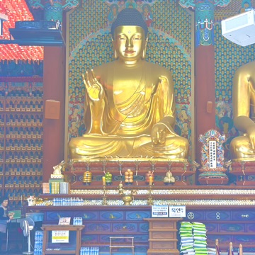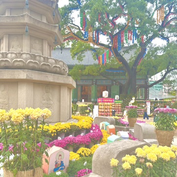 We made a quick stop at Jogyesa which is a Buddhist Temple near here too. It felt like a really random placement as it was just in a side street of the city but when you entered, there was like a whole complex! We were really fortunate that we could take our shoes off and go in to explore, it felt surreal. It didn’t feel like other temples we’d be too that are more there to show visitors, but it was a real practising temple and it was insane to be able to see close up more about it. The intricate designs on the outside were stunning and I just had to take some photos. We explored the outside area where there was different parts full with flowers, trees with decorations and more and it felt like a little bit of a haven tucked away inside the hustle and bustle of the city life.