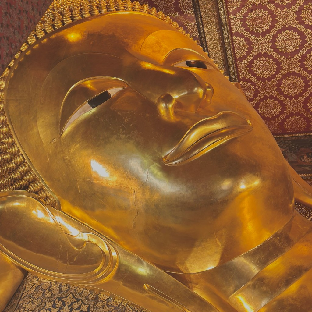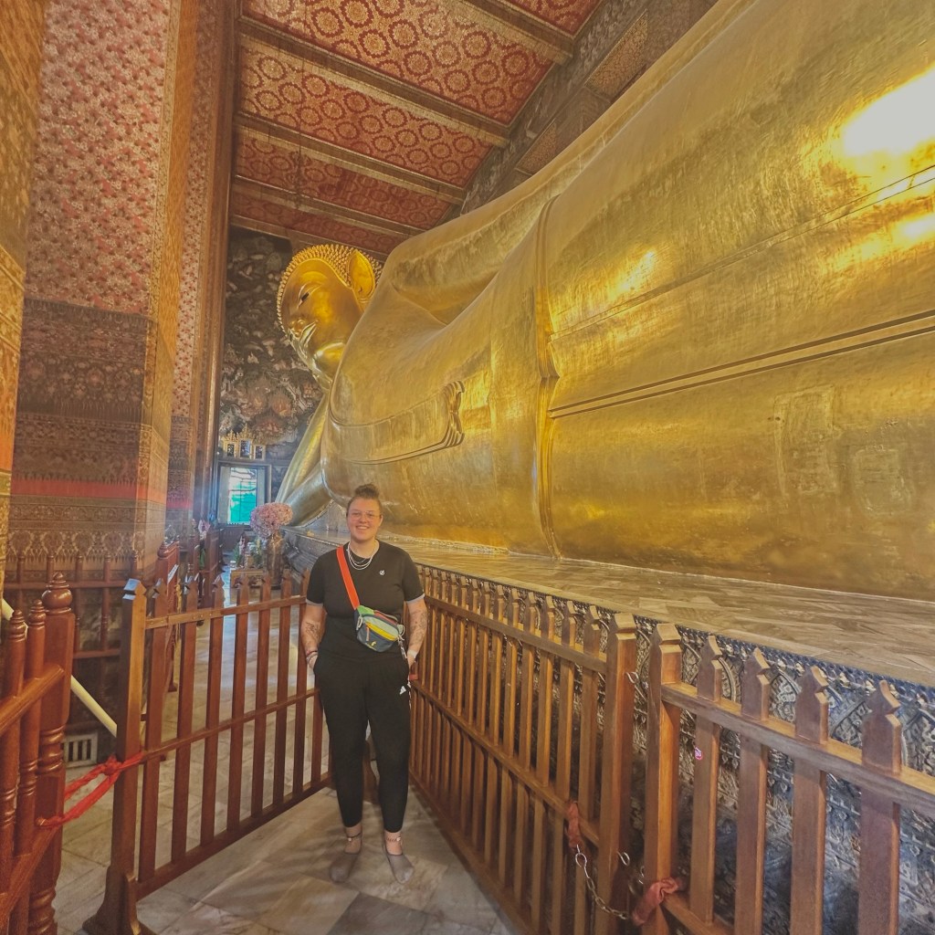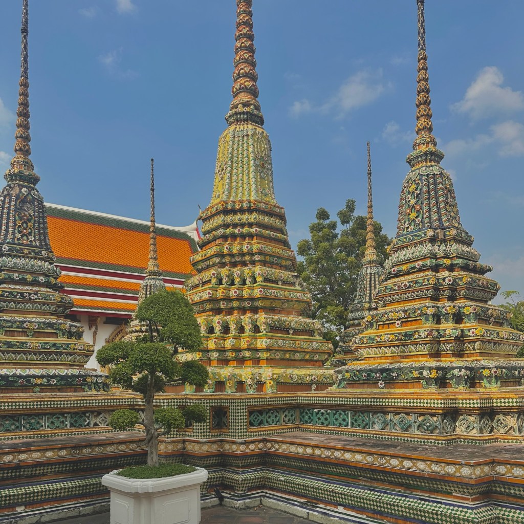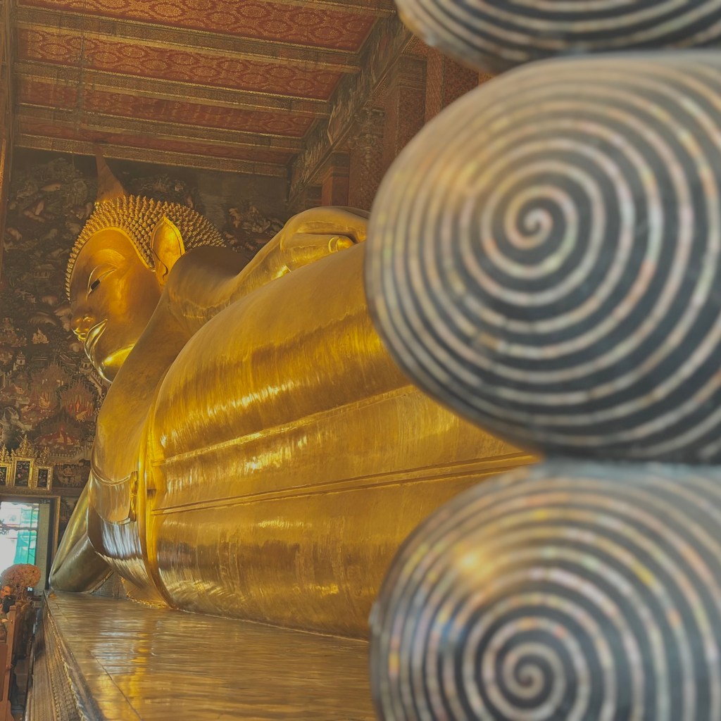 Next stop was Wat Pho; the Reclining Big Buddha. Now this was worth it, it was 300baht entry (around £7.50) and it was huge! It was still busy, but far less crowded than what I’d just experienced, and you could go round the Buddha as many times as you wanted. It was sensational, the statue itself is 46 metres long and gold plated, and I genuinely think my jaw dropped when I first saw it. I spent a good half hour just looking at it from different angles and taking lots of photos and videos. You could walk around the front and back of it too, to really see how incredibly huge it really is. It was also set inside of some really tranquil, and colourful temple grounds, which were empty compared to where I’d been before, and I really enjoyed walking around and seeing all the different areas.